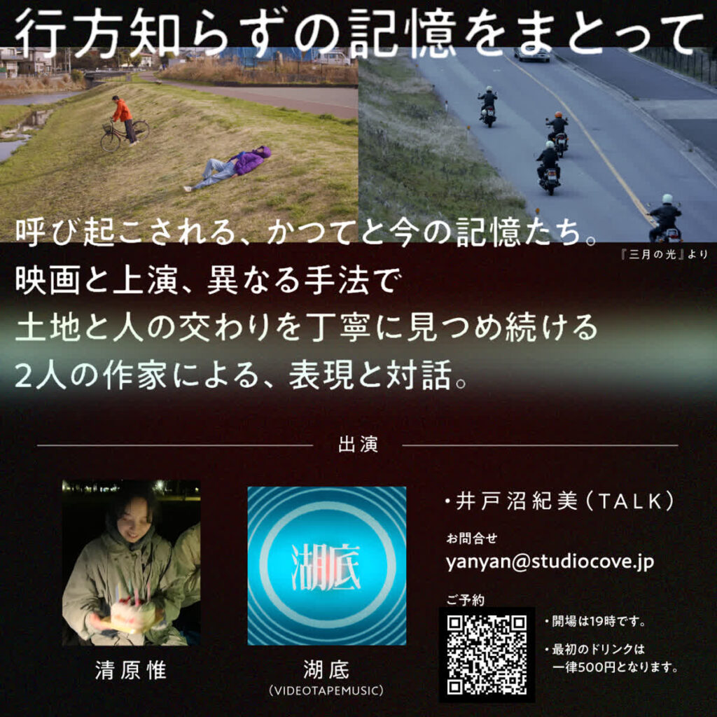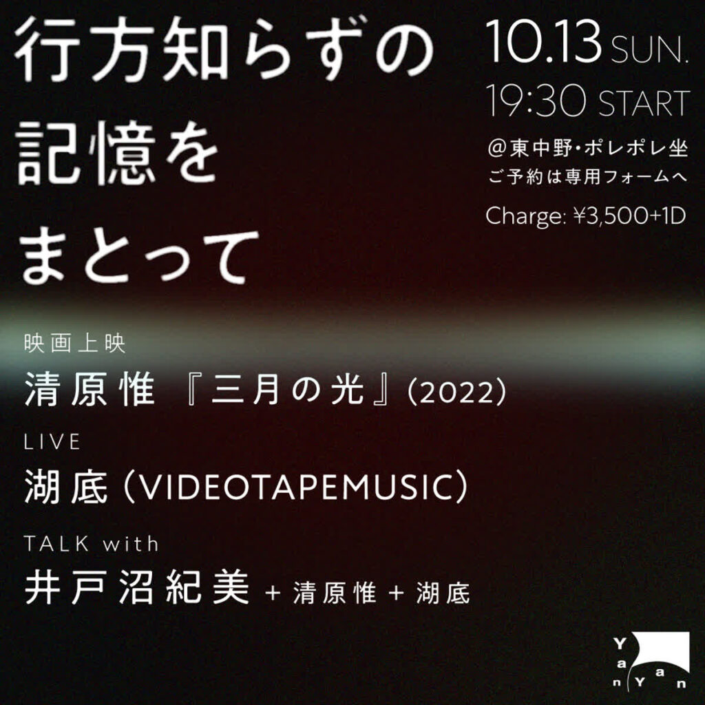 高円寺で運営する書店、ヤンヤン発のイベント企画。人々の記憶や記録からわたしたちが何を見出し、作品を制作する可能性があるのか、映画上映・ライブパフォーマンス・トークによって考える150分としました。そこにいる/かつていた人々の経験と記憶をリンクさせながら物語を展開し、場所やできごとに紐づく人々の営みをどのように歴史化できるか、という可能性を四次元的に拡張する試みを続ける清原惟さん。また、各地のさまざまな場面で撮影されたホームビデオに、自らの語りを重ね音楽と交わることで、世界各地にある、まだ見ぬ親密な人間関係やコミュニケーションへの想像力を掻き立てる湖底のパフォーマンス。そして、さまざまな人々が持つ小さな記憶や記録へ、映画を通して光を当て続ける活動をされている井戸沼紀美さんの言葉も合わせていただきながら、観客のみなさんと共に思考をしました。