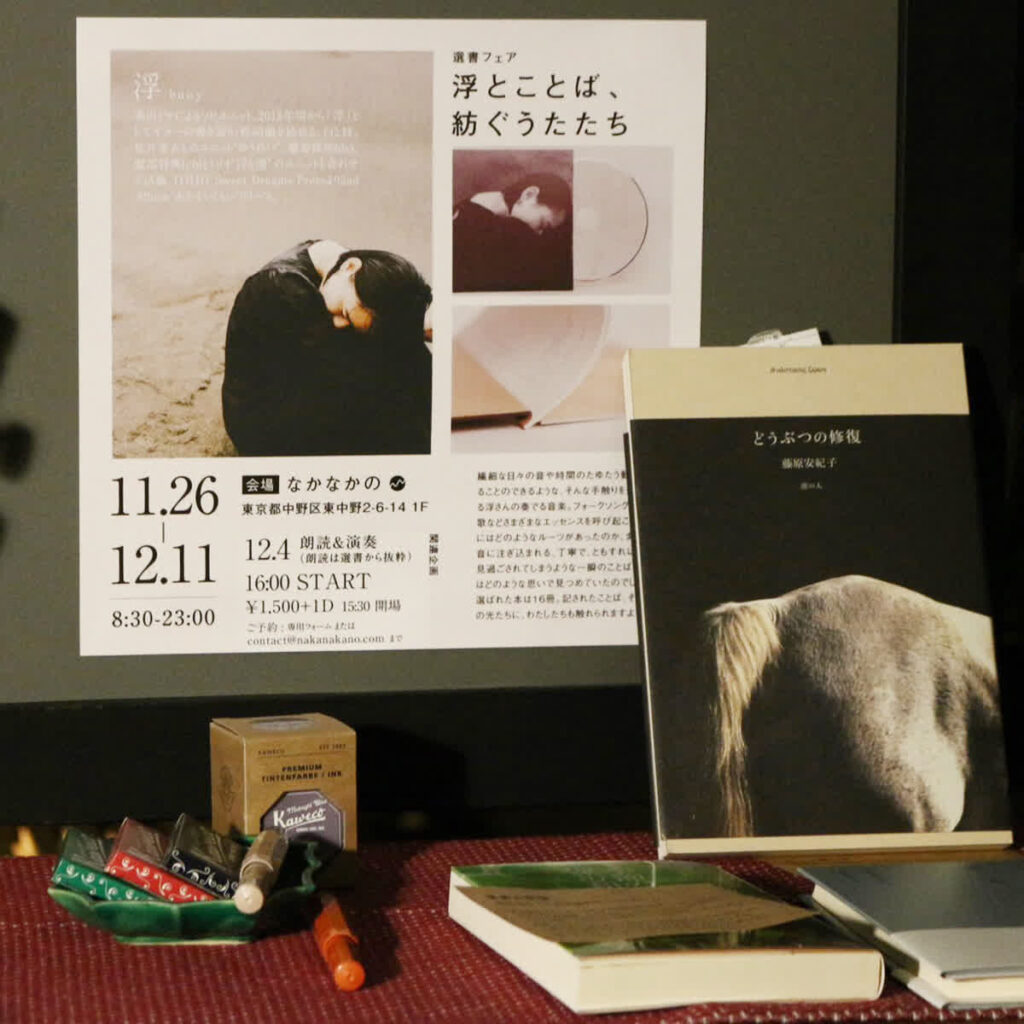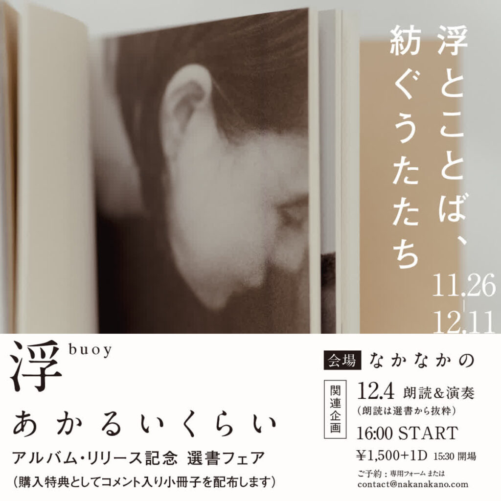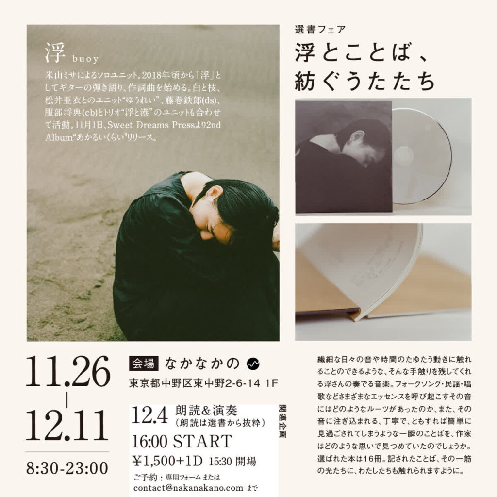 2022年11月、シンガーソングライターの浮(米山ミサ)さんがリリースした『あかるいくらい』。全国各地を旅人のように訪れながら、日常の一瞬をきらめく永遠のような時間に残しうたい続ける彼女のうたに注目し、アルバムのリリース記念として、彼女のうた作りのルーツともなるような書籍の選書フェア・そして記念のライブを東京 東中野の「なかなかの」で行ないました。