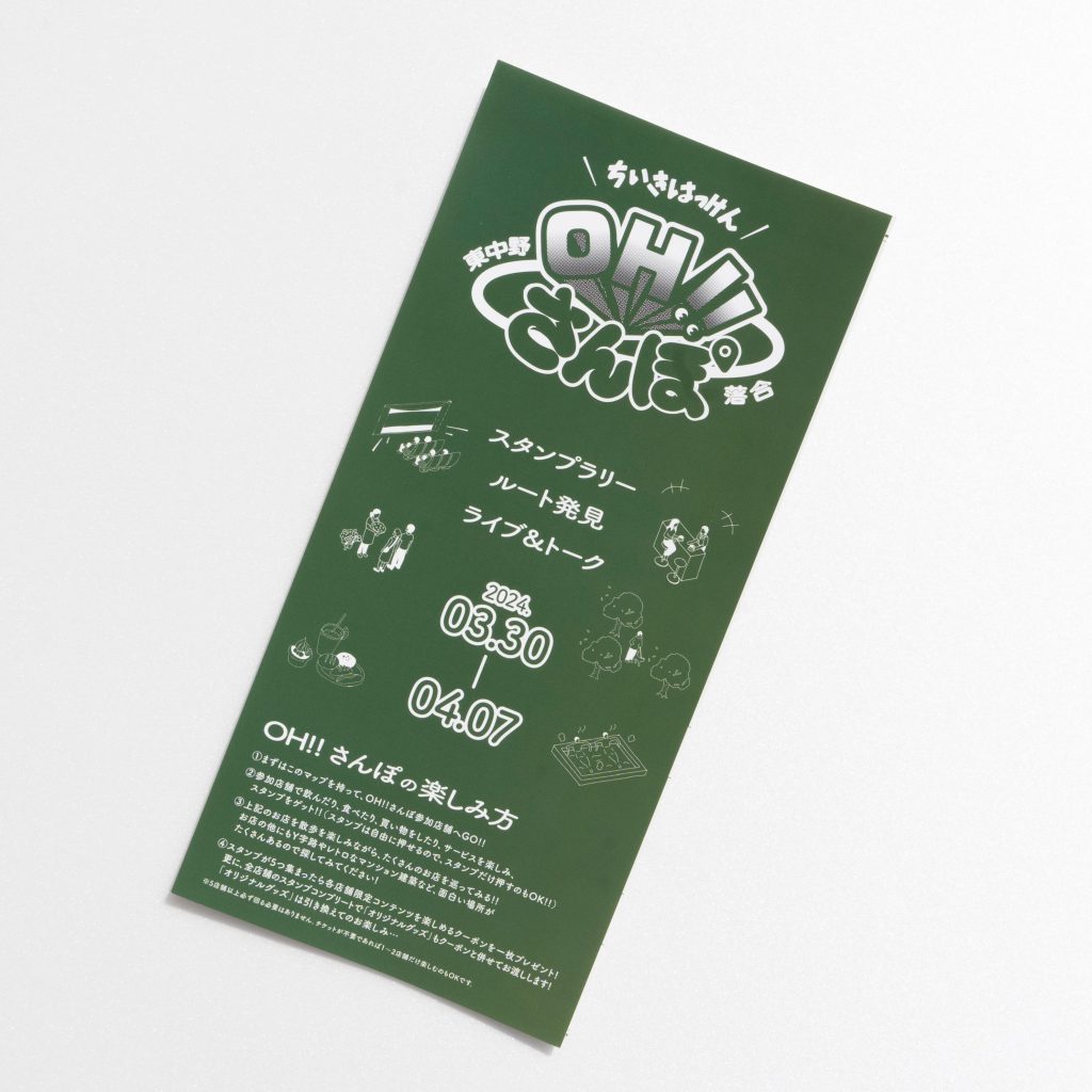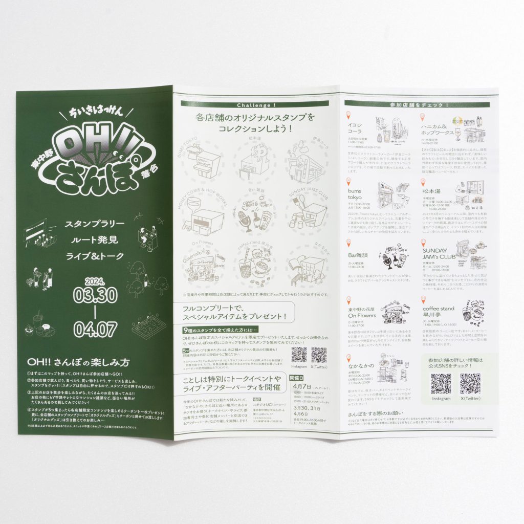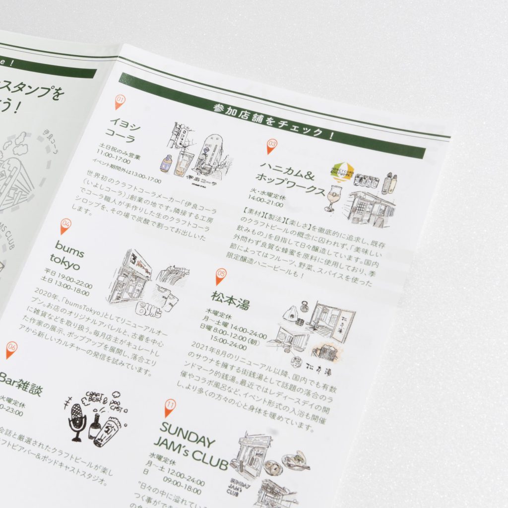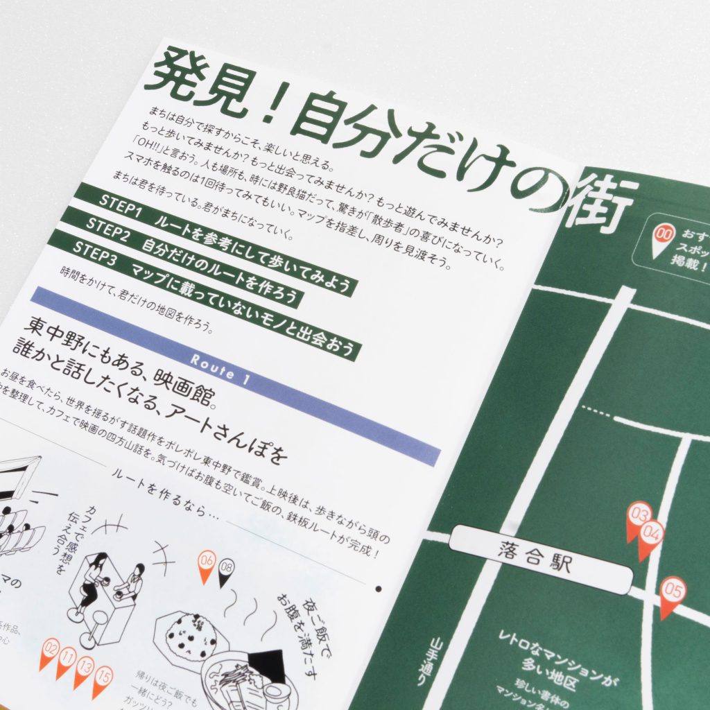 落合〜東中野エリアで春ごろ開催される多店舗ラリーイベントのマップ制作。お店の紹介はもちろん、街を楽しむヒントや、散歩の楽しみ方を伝えることにフォーカスした紙面づくりを意識しています。なかなかのも参加。